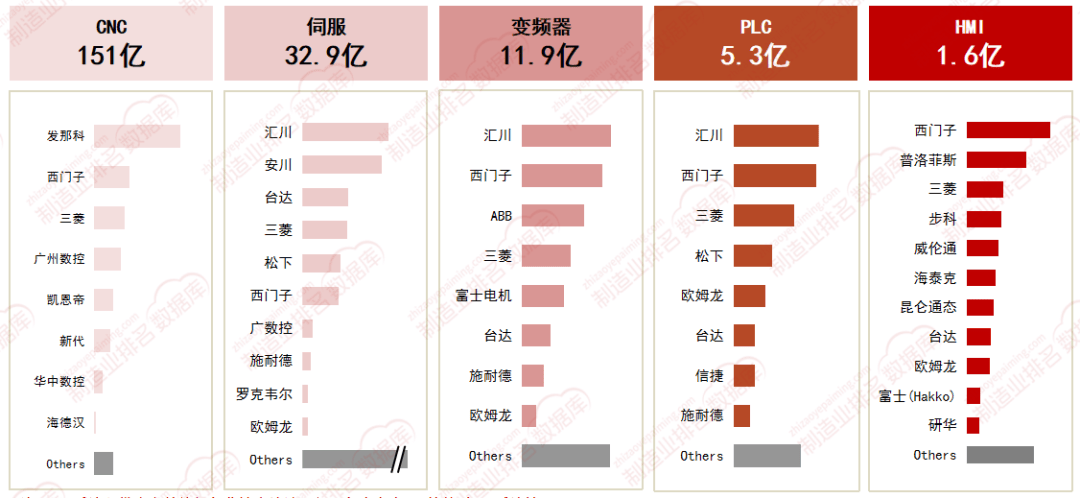 CNC产物规模较大,发那科、伺服和变频器市场中汇川、安川、西门子等是支流品牌。