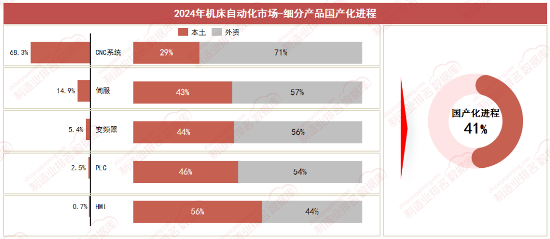 CNC行业目前低端市场根基已实现国产替代,中高端范畴仍由外资品牌从导,国产化率较低只要29%摆布,伺服、变频器和PLC等产物国产程度目前曾经逐渐攀升,目前正在45%摆布。